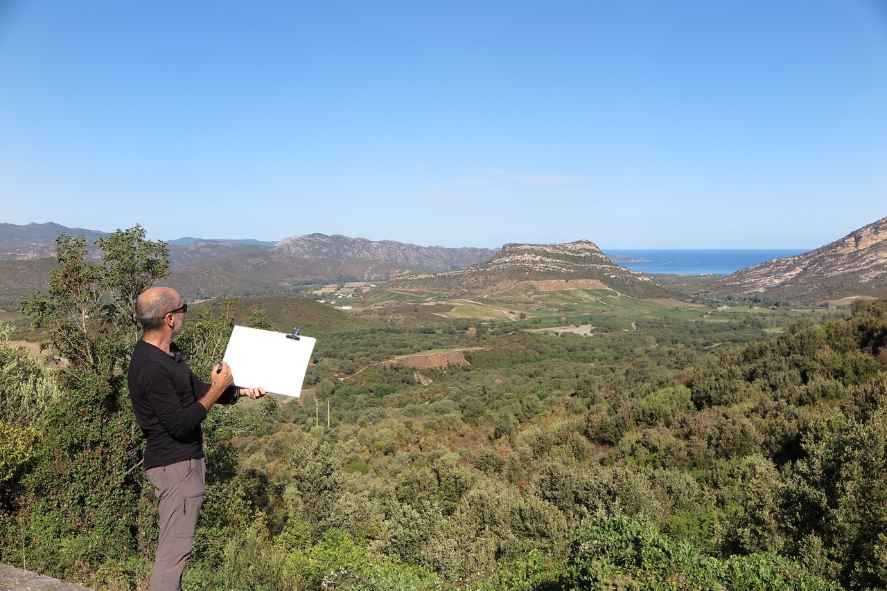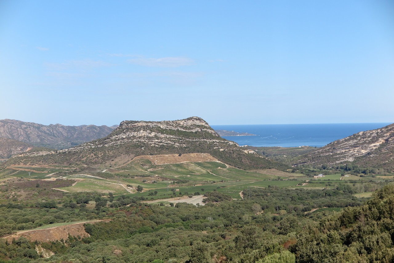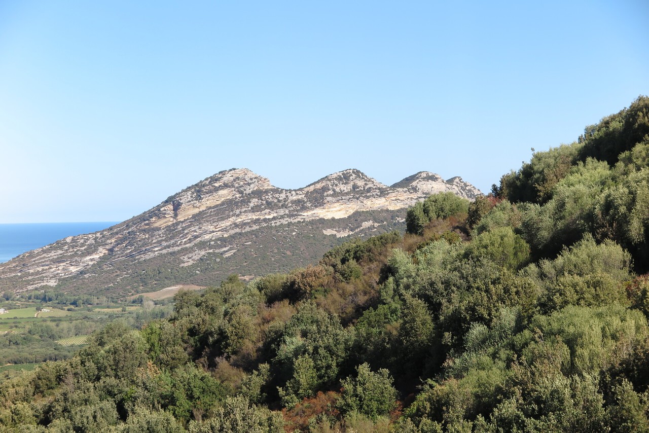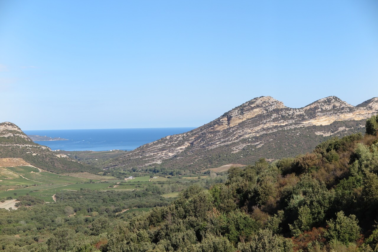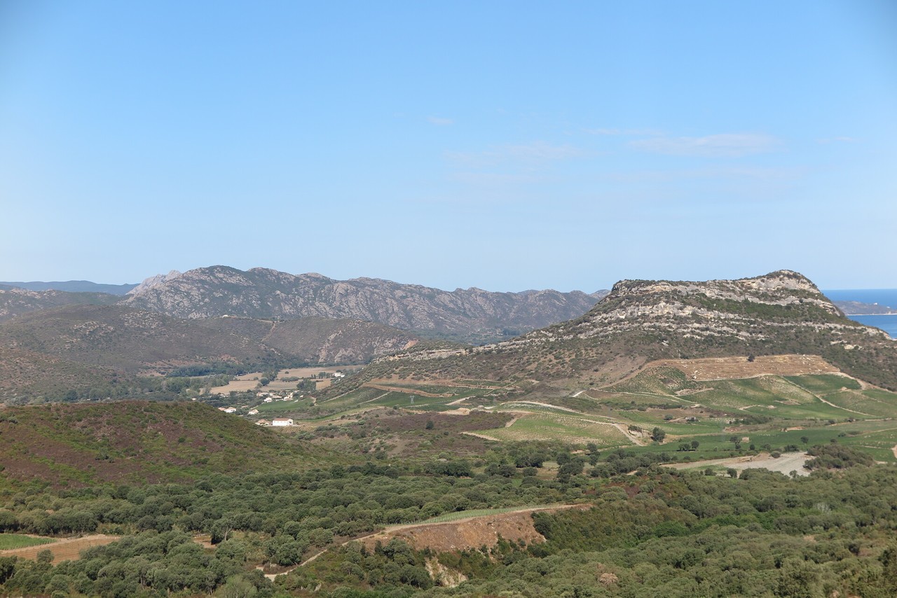 This first provides a panoramic overview of the bay of Saint-Florent and of its surrounding geological formations. Towards the west, two main topographic formations stand out, with visible planar structures. The more distant Tenda massif, west of the bay, dips to the east. In contrast, the Miocene Limestones, east of the bay, dip to the west.
