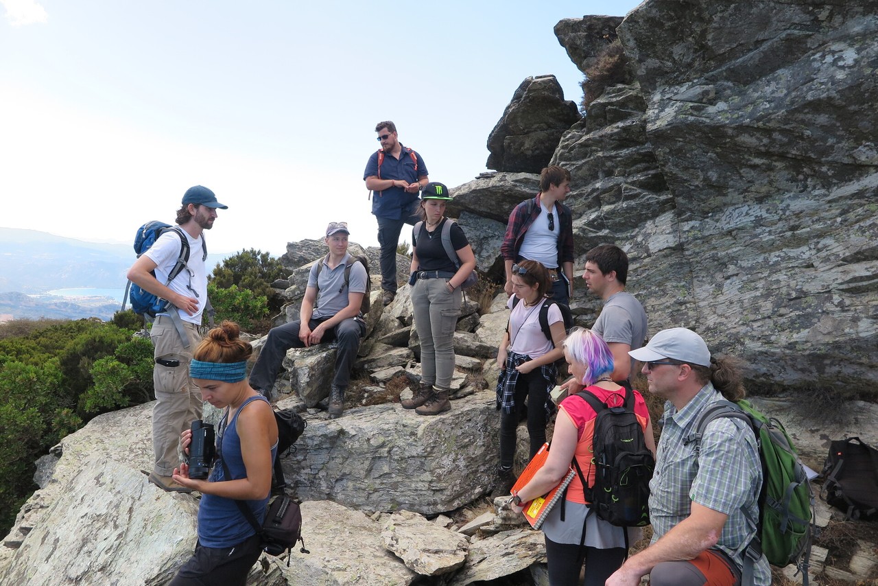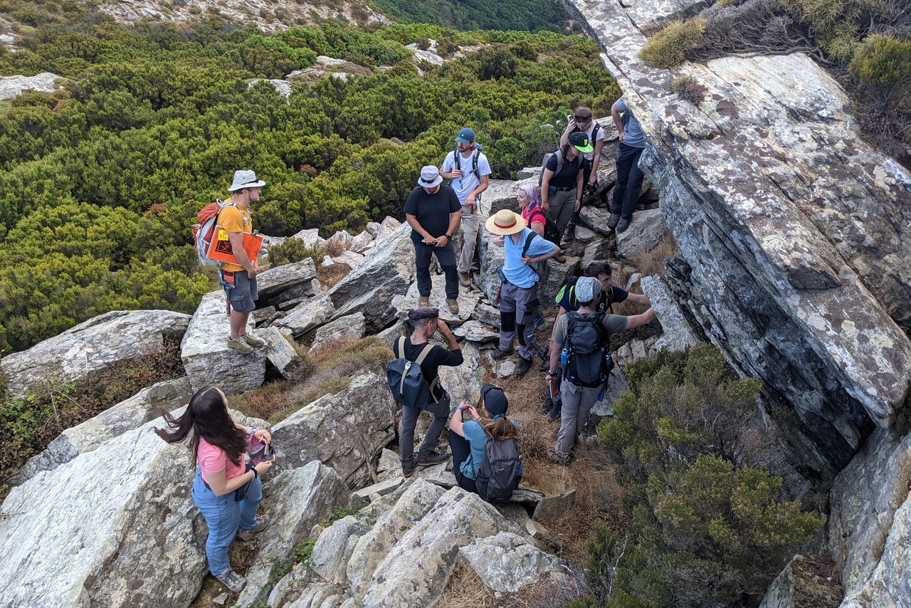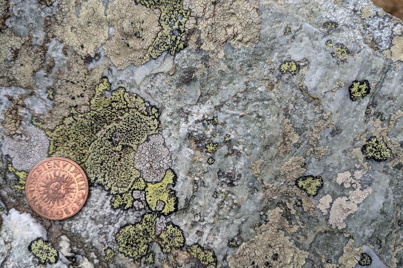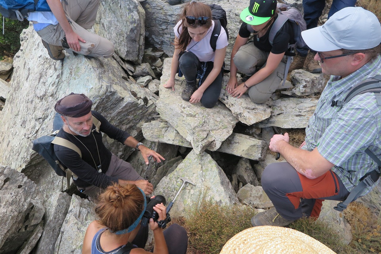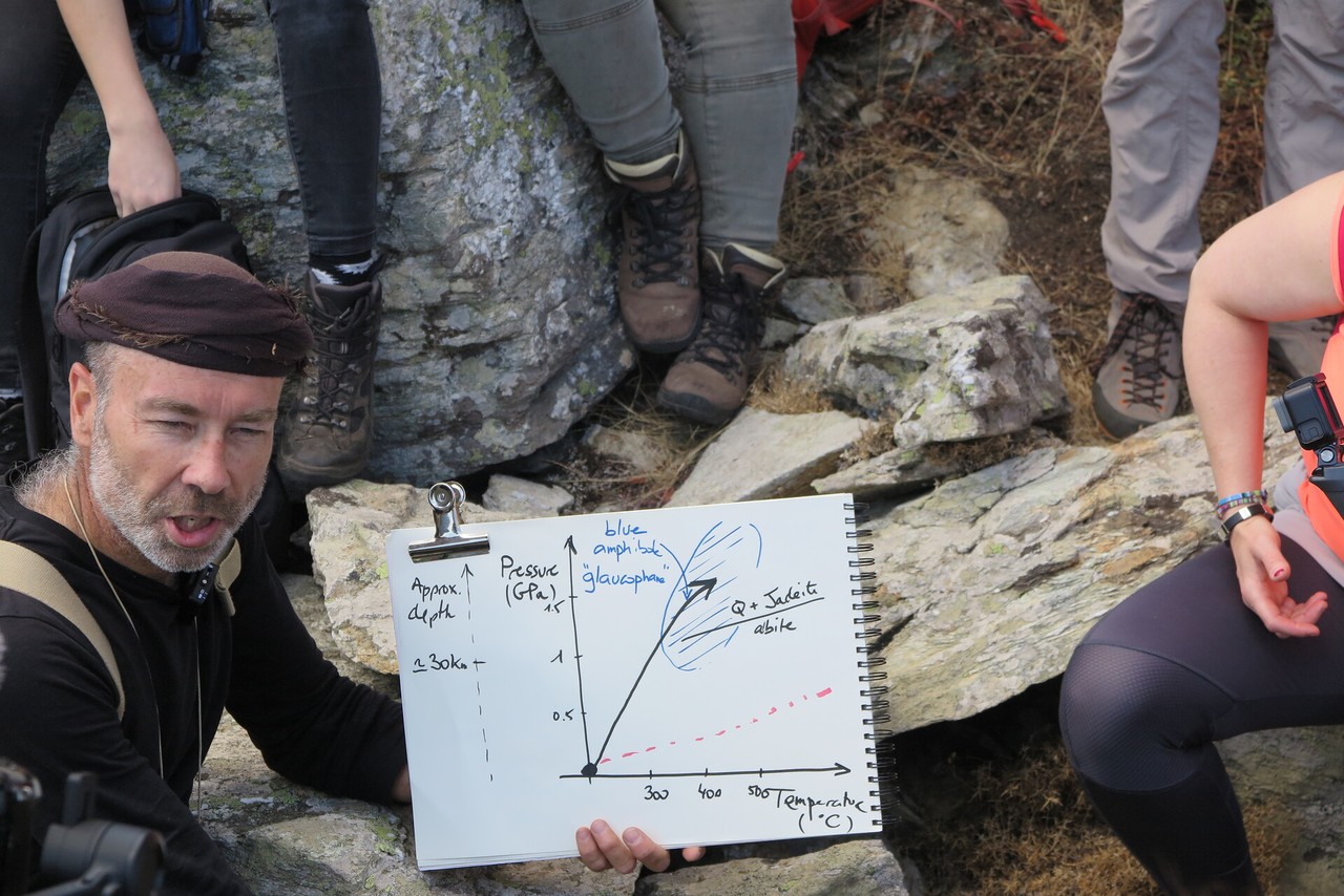 Continuing along the crest towards the north, we again encounter some feldspar-rich felsic gneisses of the Serra di Pigno unit. In contrast to the last location, here we can observe a light-greenish mineral called jadeite. In fact, this is not pure jadeite (nor gem jade), but its composition is very close. This mineral indicates metamorphism at high-pressure and low- to intermediate-temperature, hence at conditions typically found within subduction zones (i.e., material brought at great depth yet maintained relatively cold). In the same rock, we also find another mineral, albite (Na-rich feldspar), which partly replaces jadeite and is formed by the breakdown of jadeite at lower pressure conditions, during retrograde metamorphism. This evolution accompanied the return of the rock towards the earth's surface, in other words, its exhumation. This metamorphic evolution overall indicates that this fragment of continental crust was subducted at ~30-40 km depth and then returned to the surface.