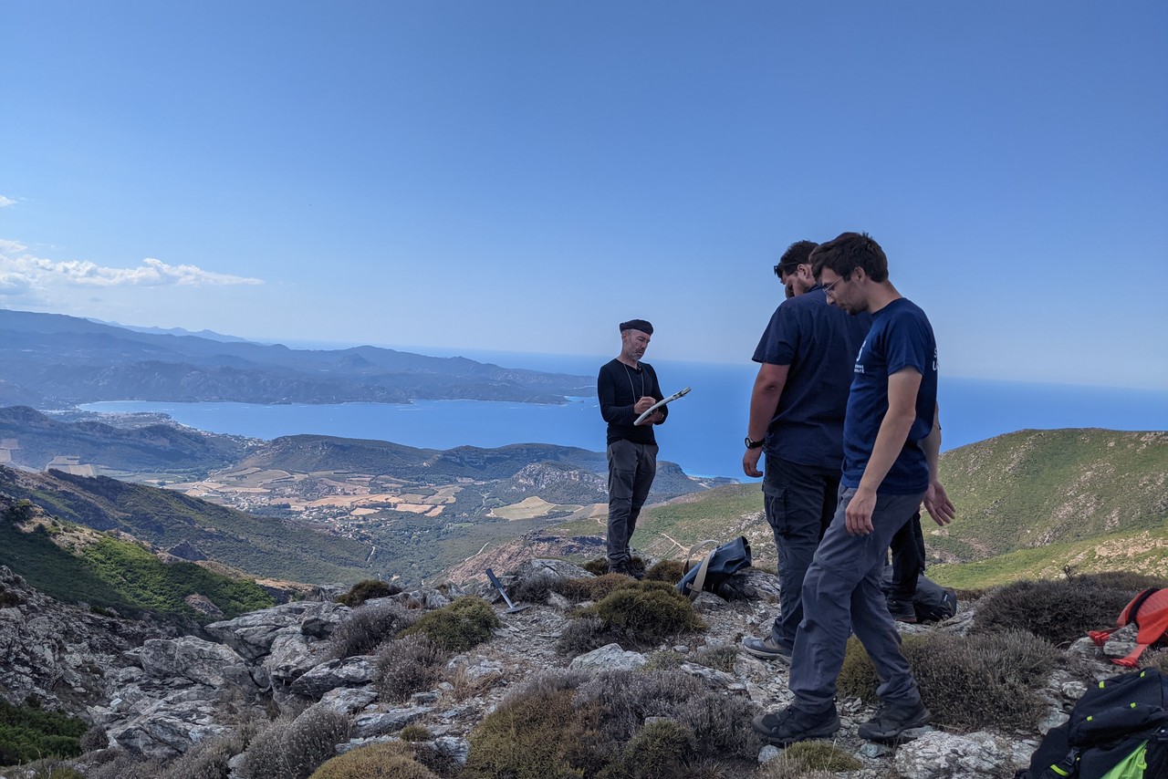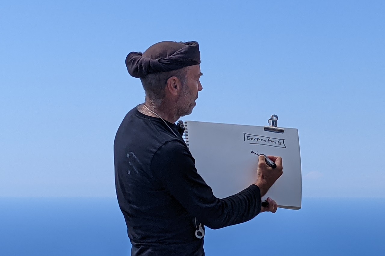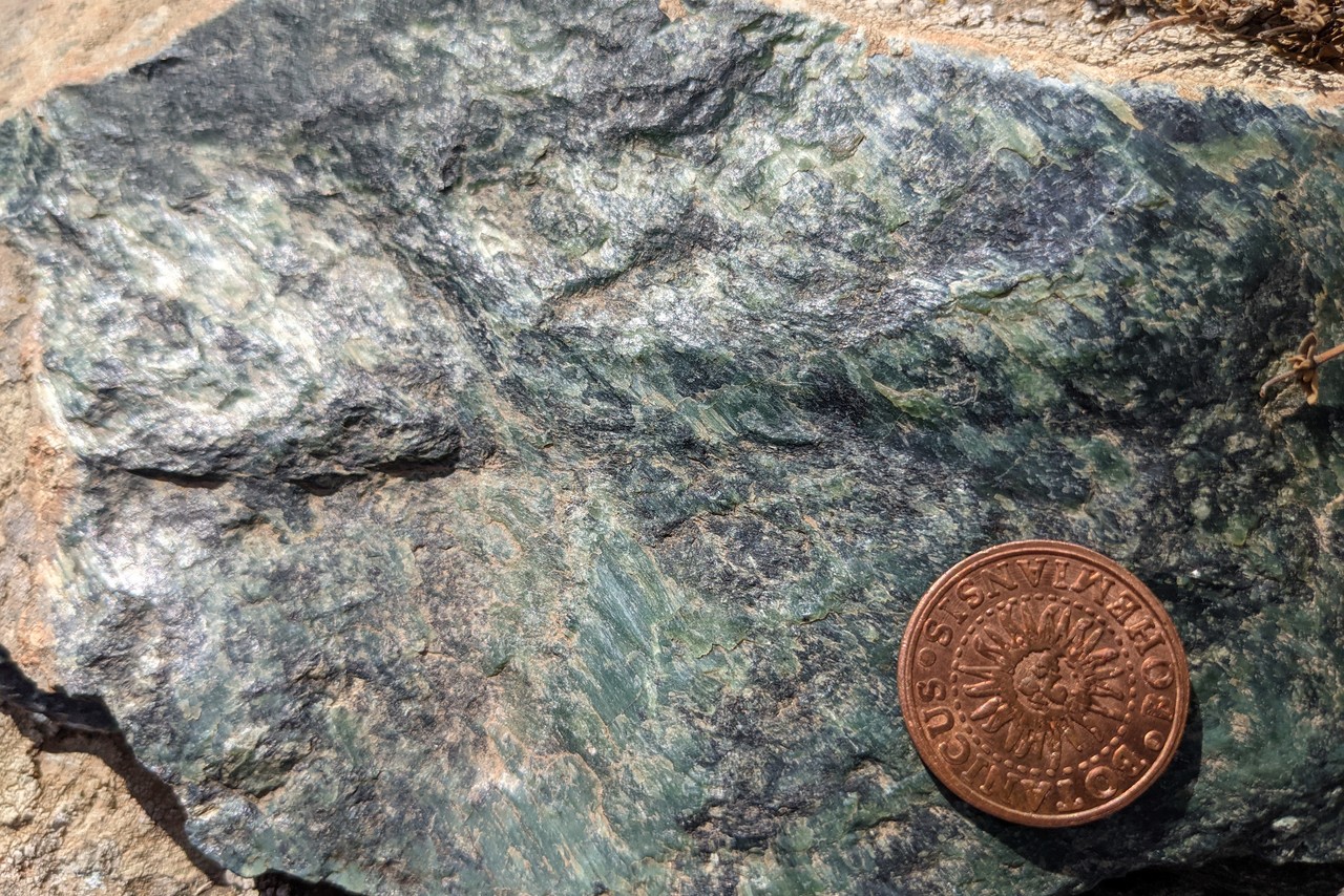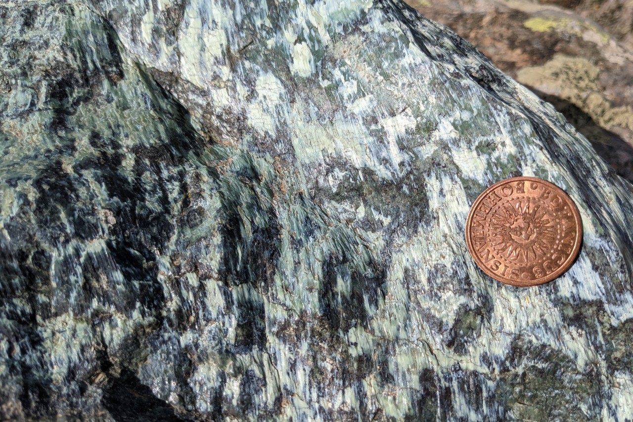 This locality, which lies slightly north of stop S1-5, represents a structural level immediately above the jadeite gneisses. The rock in this outcrop has a shiny and almost greasy, dark green appearance, covered in places by a whitish weathering rind. It is called serpentinite due to its similarity to snakeskin. Serpentinite is a largely monomineralic rock composed of the mineral serpentine. This mineral forms by the hydration of olivine, the most abundant mineral in peridotite, the rock that forms most of the earth's upper mantle. This means that the serpentinite represents a former slice of the mantle. The variety of serpentine minerals, here antigorite, indicates that these serpentinites experienced high-pressure conditions similar to the jadeite-bearing gneisses of stop S1-5.