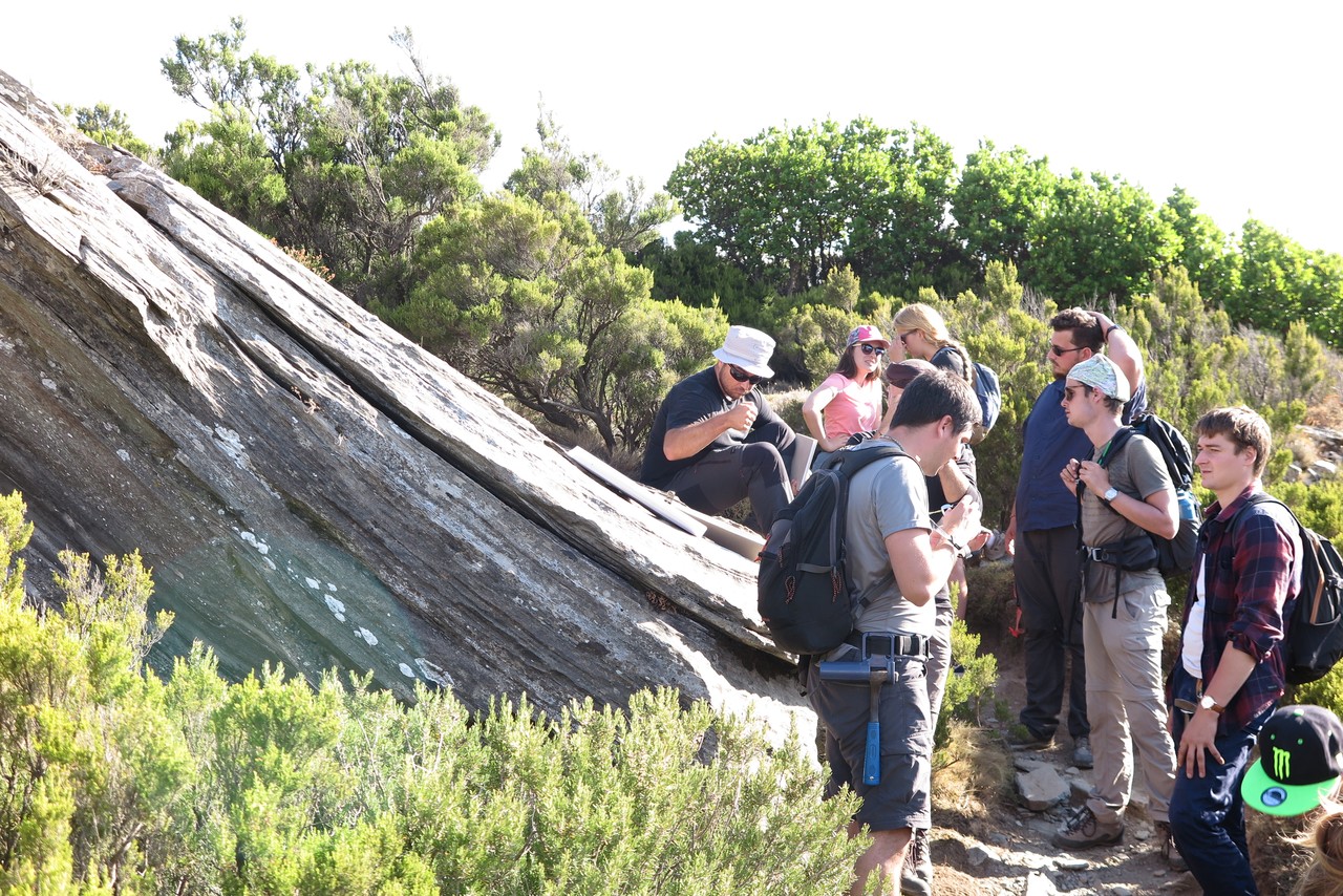 In this outcrop (in fact located just between stops S1-6 and S1-7), we can observe metasediments that directly overlie the serpentinites (and probably the gabbros as well) along an unconformity. The metasediments are well-stratified and with silty grain size. Some layers are siliceous and consist of white mica, feldspar, quartz, and some amphibole. Most other layers are carbonate-rich, and the transitions between both end-members are gradual.