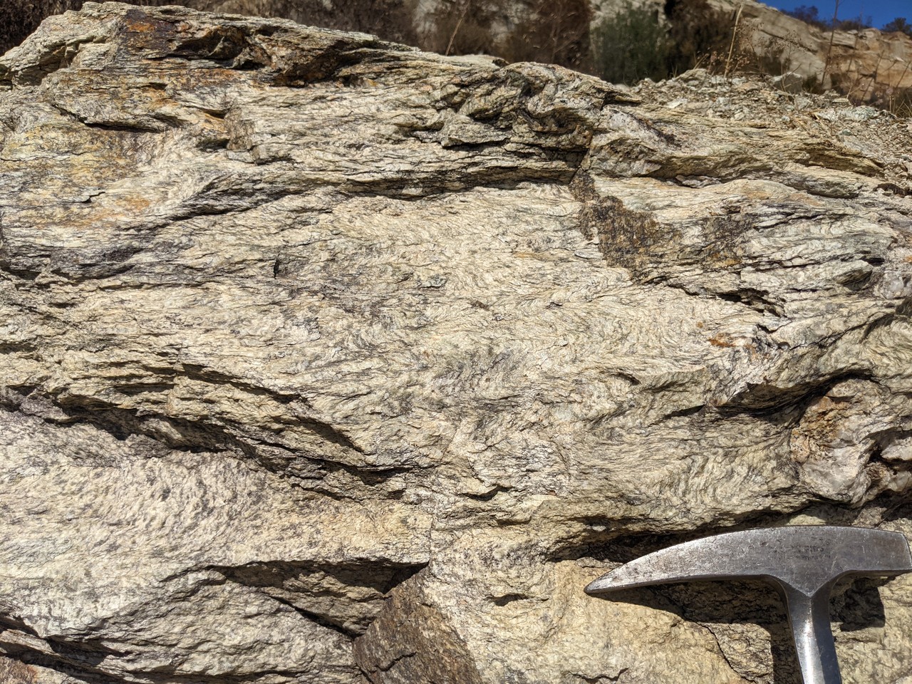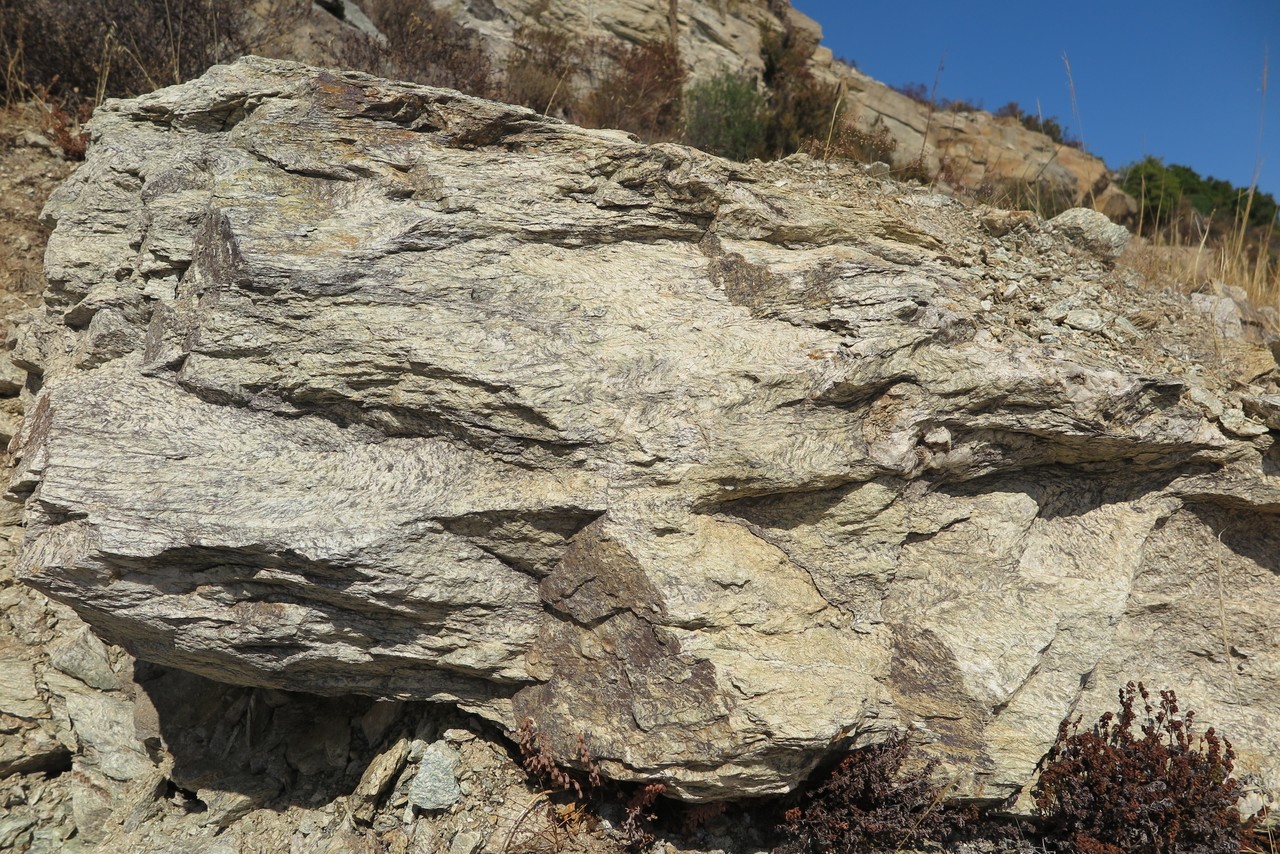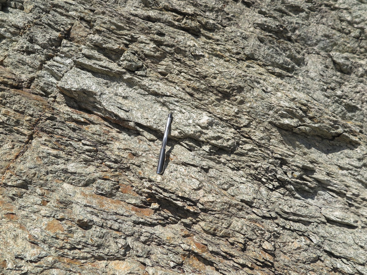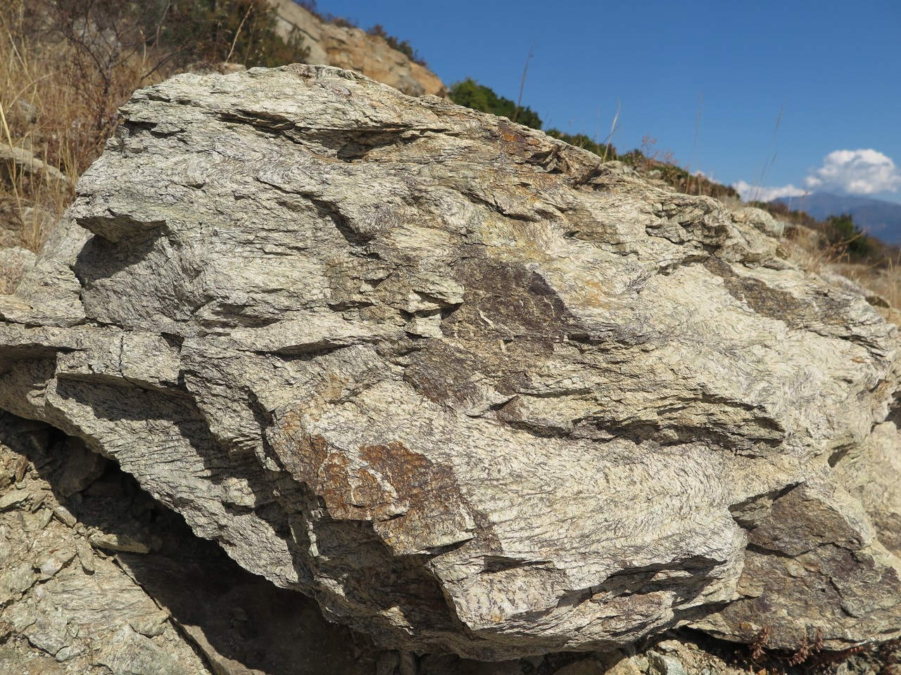 This locality is the former Fontana Morello quarry, directly at the road ca. 2 km southwest of Saint-Florent. We can see patches of weakly deformed metagranites that gradually transition to gneisses with well-developed schistosity. These zones of localized deformation are interpreted as interconnected shear zones formed during the subduction and exhumation of the Tenda Massif. The dominant lithology consists of gneisses with the main foliation shallowly dipping and plunging towards the east. Most of the Tenda massif represents felsic granitic lithologies as mylonites made of quartz, albite and phengite that are sometimes associated with chlorite.