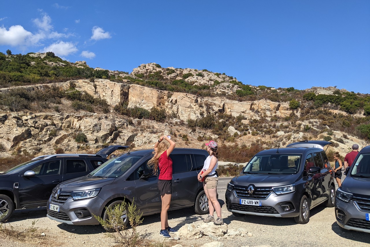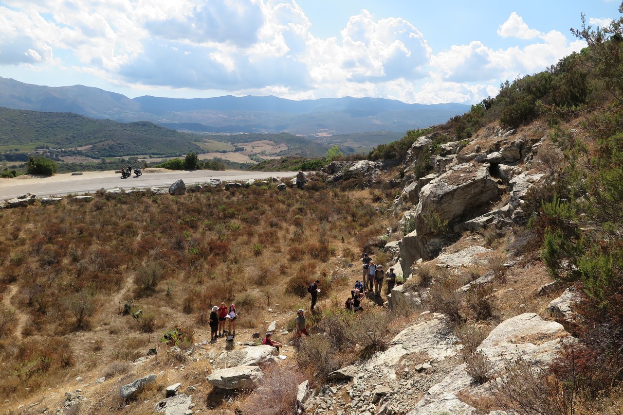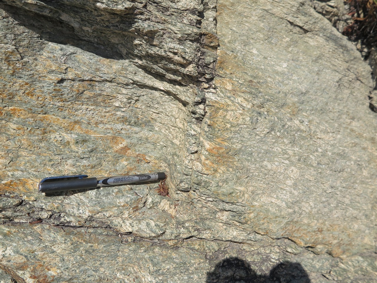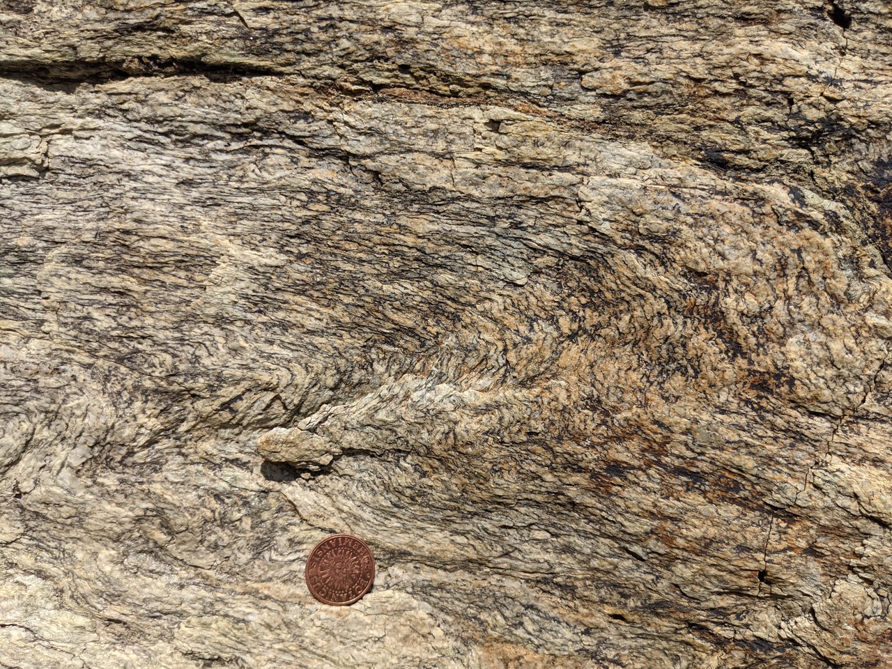 This locality is the former Fontana Morello quarry, directly at the road ca. 2 km southwest of Saint-Florent. We can see patches of weakly deformed metagranites that gradually transition to gneisses with well-developed schistosity. These zones of localized deformation are interpreted as interconnected shear zones formed during the subduction and exhumation of the Tenda Massif. The dominant lithology consists of gneisses with the main foliation shallowly dipping and plunging towards the east. Most of the Tenda massif represents felsic granitic lithologies as mylonites made of quartz, albite and phengite that are sometimes associated with chlorite.
