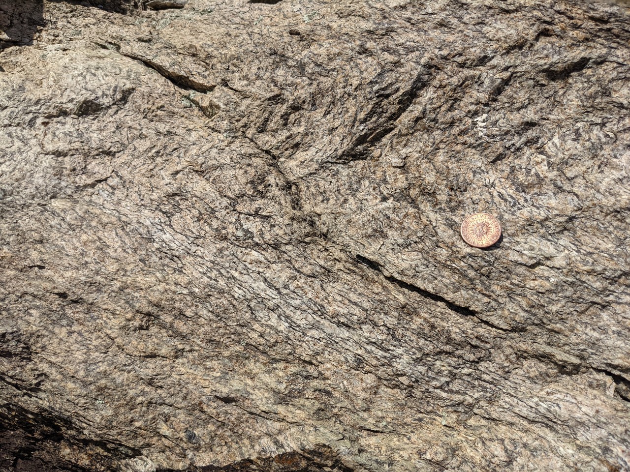 This locality is the former Fontana Morello quarry, directly at the road ca. 2 km southwest of Saint-Florent. Here, we can see patches of weakly deformed metagranites that gradually transition to gneisses with well-developed schistosity. These zones of localized deformation are interpreted as interconnected shear zones formed during the subduction and exhumation of the Tenda Massif.