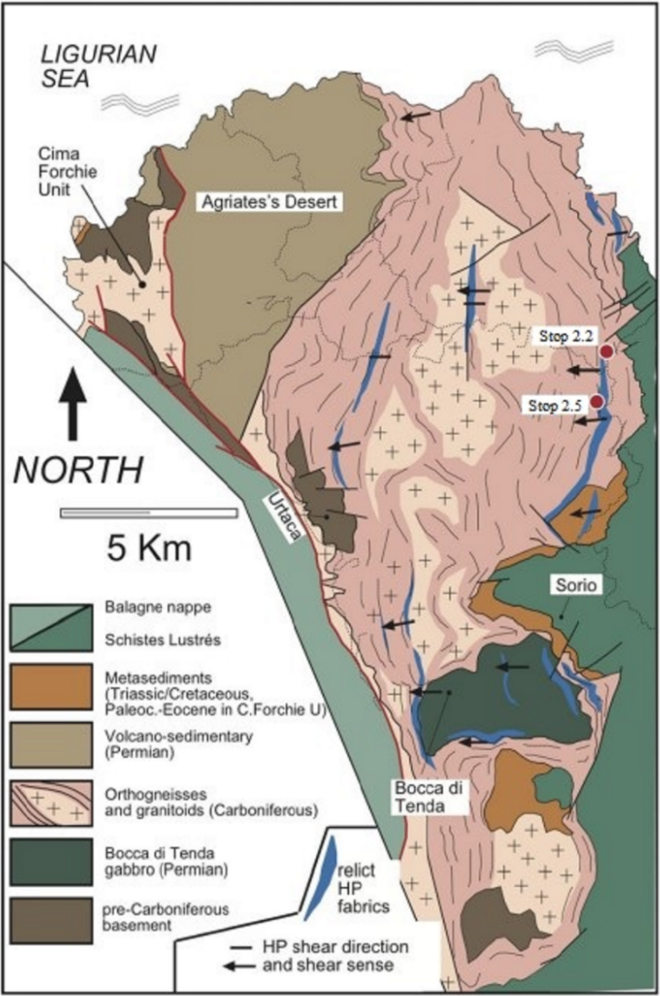 Tenda Massif shows significant variations from the north to the south of the unit near S. Pietro di Tenda: metabasites stratigraphically followed by micaschists (with a large quantity of quartz) and calcschists. On the SE edge of the Tenda massif crop out pure quartzites, marbles and calcschists. Tenda massif represents highly deformed continental crust below the oceanic units built during the surrection of the Alps on a Hercynian base at the end of the Paleozoic. The summary of the geological structure of the area is shown in the figure 1.